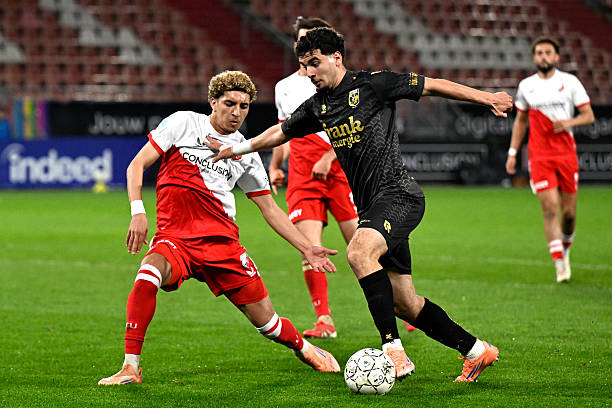 , NETHERLANDS - APRIL 13: (L-R) Massien Ghaddari of FC Utrecht 23, Omar Achouitar of Vitesse during the Dutch Keuken Kampioen Divisie match between FC Utrecht U23 v Vitesse on April 13, 2026 (Photo by Gerrit van Keulen/Soccrates/Getty Images)