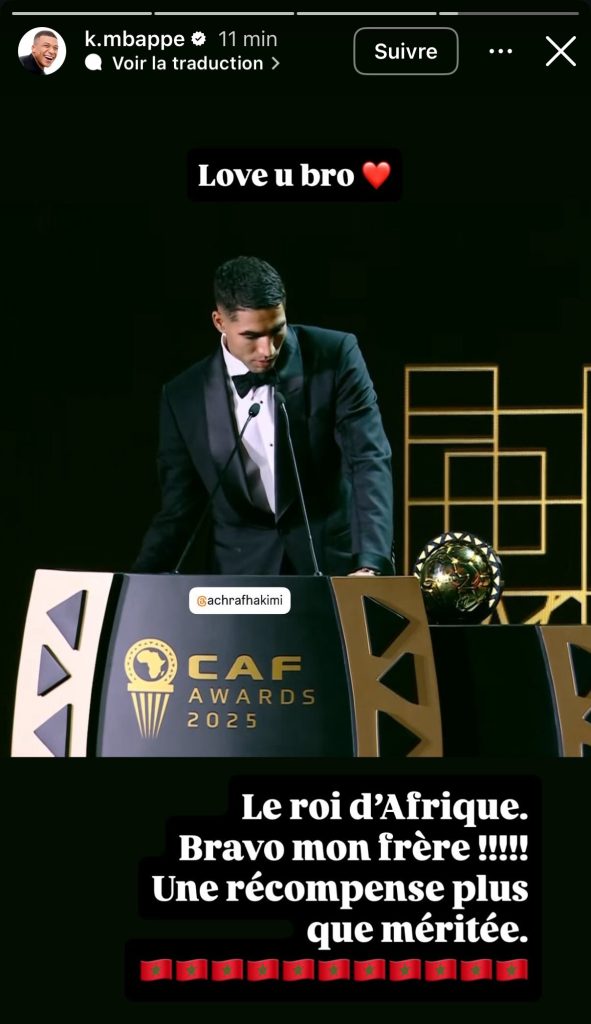 Accueil » CAF Awards » Ballon d’Or africain 2025 : Kylian Mbappé félicite Achraf Hakimi