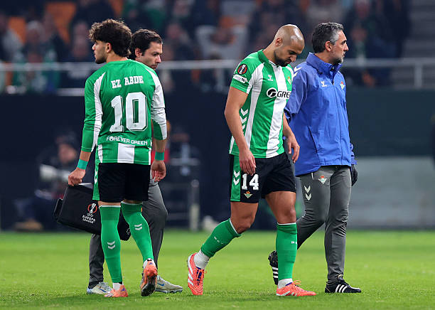SEVILLE, SPAIN - NOVEMBER 27: Sofyan Amrabat of Real Betis reacts as he leaves the pitch with an injury during the UEFA Europa League 2025/26 League Phase MD5 match between Real Betis Balompie and FC Utrecht at La Cartuja de Sevilla on November 27, 2025 in Seville, Spain. (Photo by Fran Santiago/Getty Images)