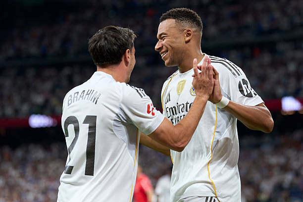 MADRID, SPAIN - OCTOBER 04: Kylian Mbappe of Real Madrid CF celebrates after scoring his team's third goal with his teammate Brahim Diaz of Real Madridduring the LaLiga EA Sports match between Real Madrid CF and Villarreal CF at Estadio Santiago Bernabeu on October 04, 2025 in Madrid, Spain. (Photo by Mateo Villalba/Getty Images)