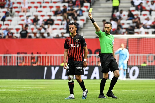 The referee Jeremie PIGNARD gives a yellow card to TFC player and Sofiane DIOP of Nice during the Ligue 1 Uber Eats match between Nice and Toulouse at Allianz Riviera on May 21, 2023 in Nice, France. (Photo by Pascal Della Zuana/Icon Sport via Getty Images)