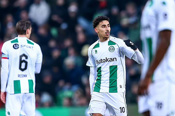 GRONINGEN, NETHERLANDS - FEBRUARY 8: Younes Taha of FC Groningen celebrates after scoring his sides first goal during the Dutch Eredivisie match between FC Groningen and PSV at Stadion Euroborg on February 8, 2026 in Groningen, Netherlands. (Photo by Pieter van der Woude/BSR Agency/Getty Images)