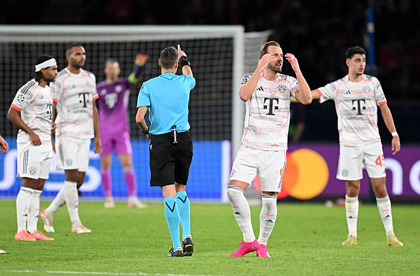 PARIS, FRANCE - NOVEMBER 04: Harry Kane of Bayern Munich reacts to the Referee, Maurizio Mariani, sending off teammate Luis Diaz (not pictured) during the UEFA Champions League 2025/26 League Phase MD4 match between Paris Saint-Germain and FC Bayern München at Parc des Princes on November 04, 2025 in Paris, France. (Photo by Stuart Franklin/Getty Images)