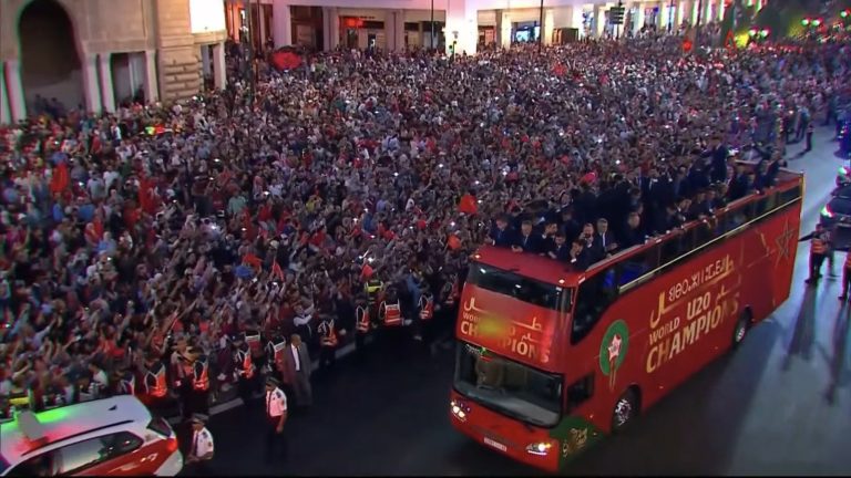Des milliers de Marocains se sont réunis ce mercredi à Rabat pour célébrer le retour triomphal des Lionceaux de l’Atlas, sacrés champions du monde U20 au Chili. Dans une ambiance festive et colorée, les rues de la capitale ont vibré au passage du bus à impériale transportant les héros marocains, acclamés par une foule en liesse. Les drapeaux rouges et verts flottaient fièrement tandis que les vuvuzelas résonnaient, symbolisant la fierté d’un peuple tout entier.