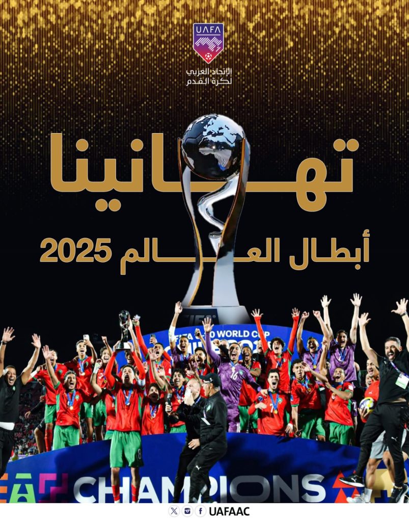 Le compte officiel de l’Union arabe de football a adressé un message de félicitations à l’équipe nationale marocaine U20 après sa victoire historique en Coupe du monde des moins de 20 ans.