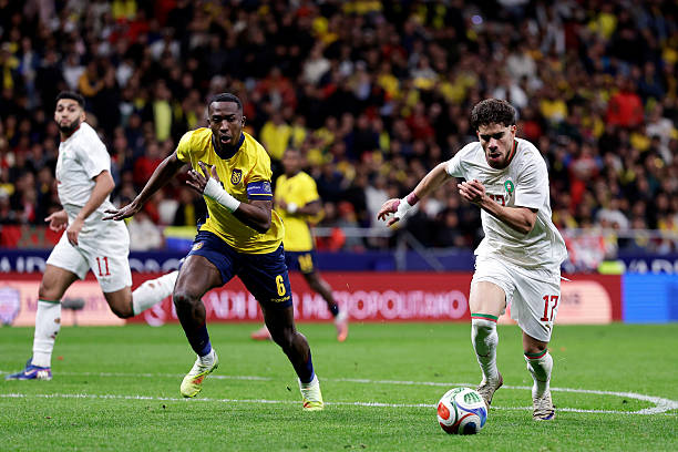 MADRID, SPAIN - MARCH 27: (L-R) Willian Pacho of Ecuador, Abdessamad Ezzalzouli of Morocco during the International Friendly match between Morocco v Ecuador at the Riyadh Air Metropolitano on March 27, 2026 in Madrid Spain (Photo by Maria Gracia Jimenez/Soccrates/Getty Images)